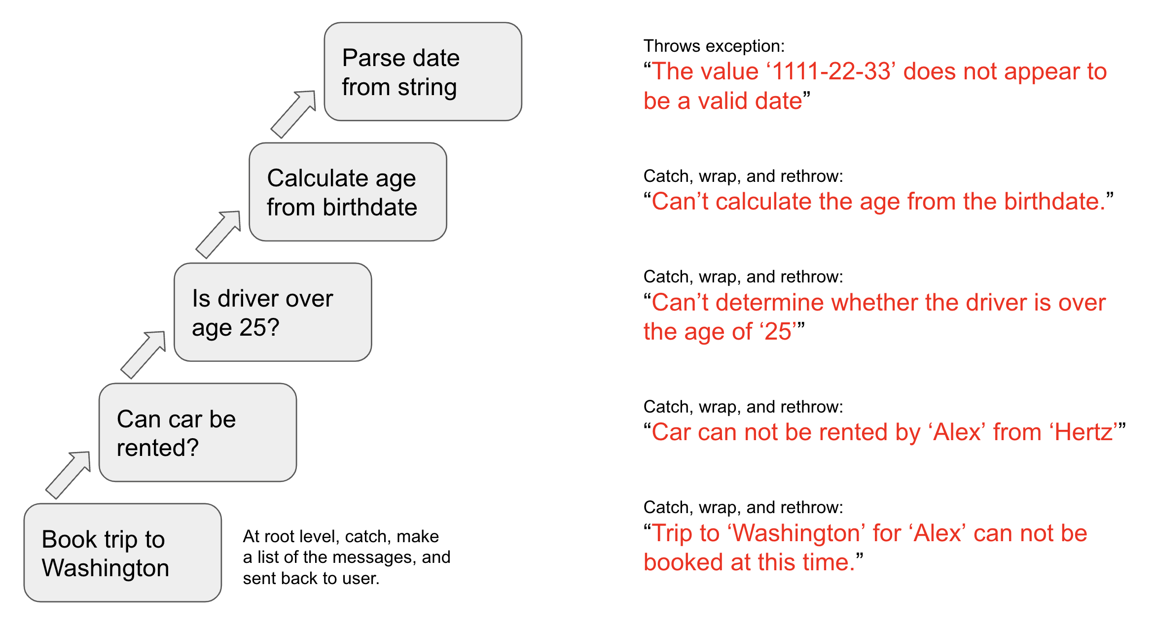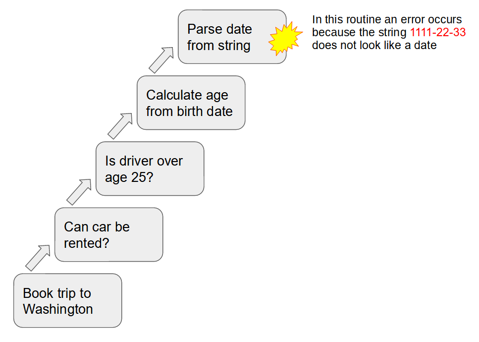 When an error occurs at this point, what must be returned and how this return value is generated? That is the topic of other blog posts.  In this post we simply define the specific scenario:  Alex wants a trip to Washington, which needs to determine if a car can be rented, which needs to know if he is over 25, which means it needs to calculate the age, which means the birth day must be converted from a string, but the string is improper.