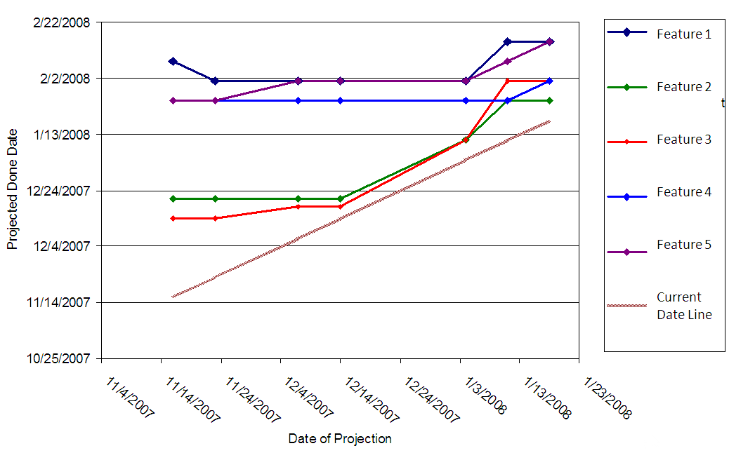 Below is a sample of real data from a project which started well before Nov 2007, and extended well past February 2008. The feature complete projection dates for that time period are plotted. At every weekly status report, each of 5 features were required to report the date that they expected to be completely finished. The graph shows how these dates changed over time.